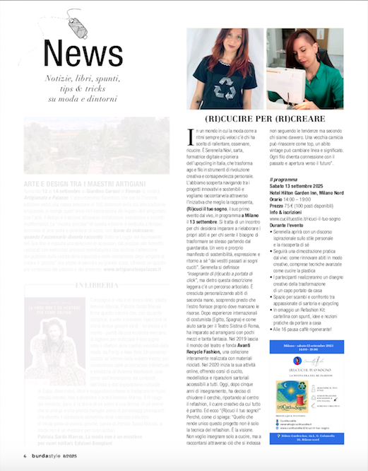 Sono apparsa come Cuciiltuostile su BurdaStyle dicembre 2023 e luglio 2025 e sulla rivista americana "SewnMagazine".